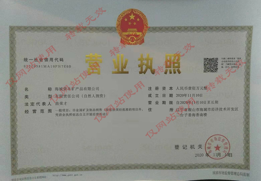 版權(quán)所有:海城榮豐礦產(chǎn)品有限公司 咨詢(xún)電話(huà):13604120688 地址:遼寧省海城市鐵西開(kāi)發(fā)區(qū)黃河路52號(hào) 遼ICP備16002086號(hào)-1